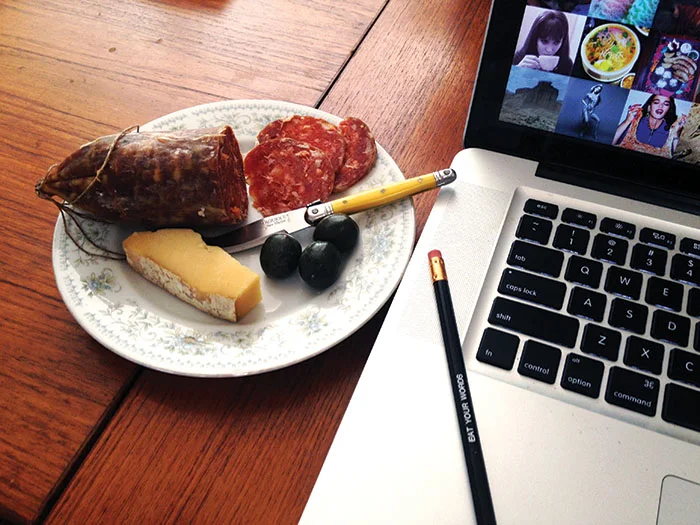 “The better question in my case is what don’t I eat — my desk has been my kitchen table for a while so, really, anything goes. But if I had to name my regular snacks I would say a handful of nuts, Dang coconut chips (they’re dangerous), an avocado doused with a glug of olive oil, salt and Aleppo pepper, or I can never go wrong with a hunk of cheese, olives and salami.”