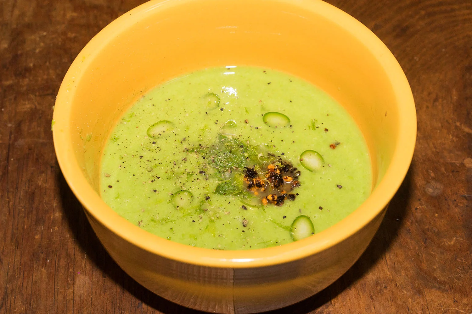 PEA SOUP WITH ASPARAGUS AND CHILI OIL